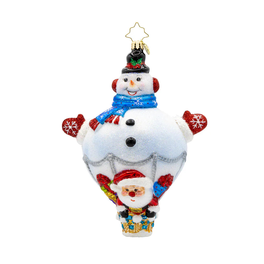 Soar through the skies on a snowy adventure with our Up, Up, and Snowy ornament. This charming piece features a friendly snowman hot-air balloon, and a jolly Santa Claus ready to embark on a festive flight.